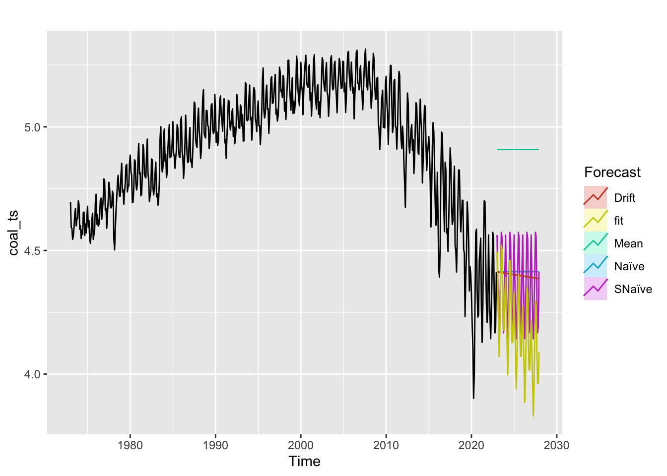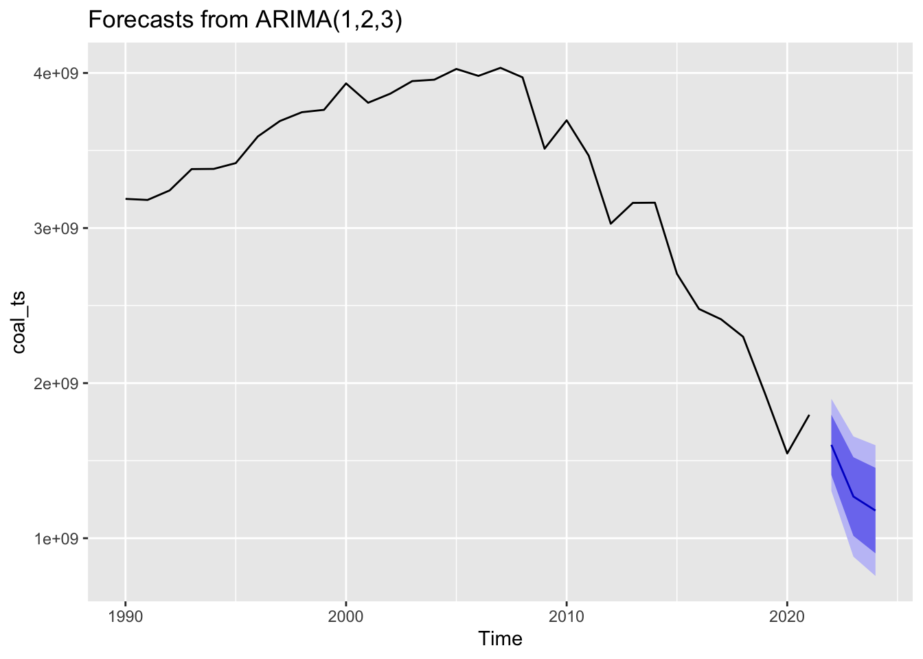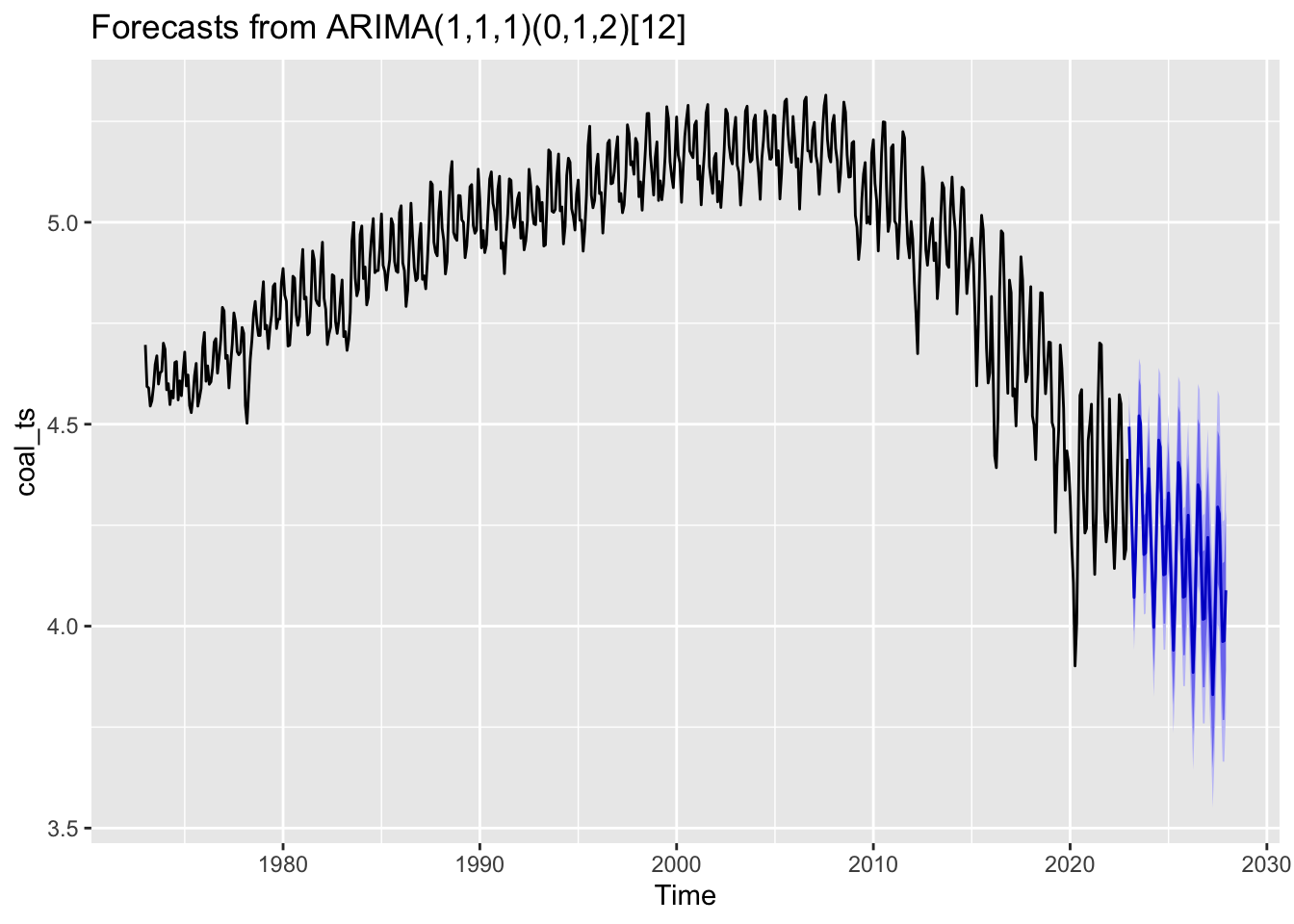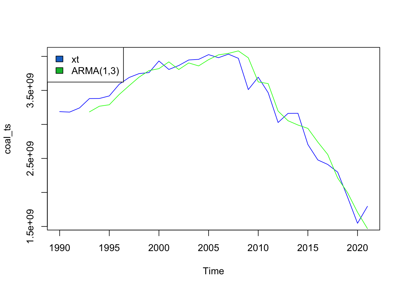 ARMA(1,3) for coal produces an AIC value of 1312.11 and a CSS value of 7.7x10^17. Using the model summary and plot of the model against the data above, it seems that the model fits the data pretty well but not perfectly. The randomness and sensitivity of the original data makes it hard for the model to truly fit well without overfitting. To achieve a better fit would require overfitting the training data and wouldn’t generalize well to new data.