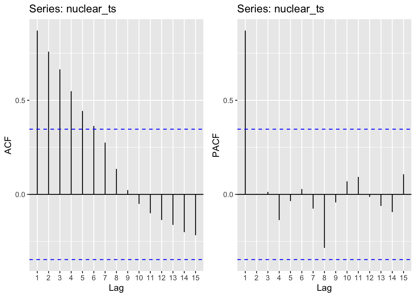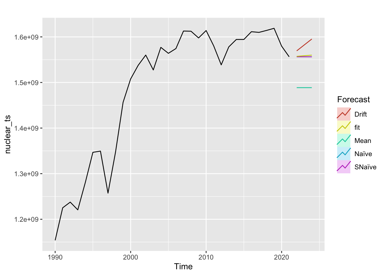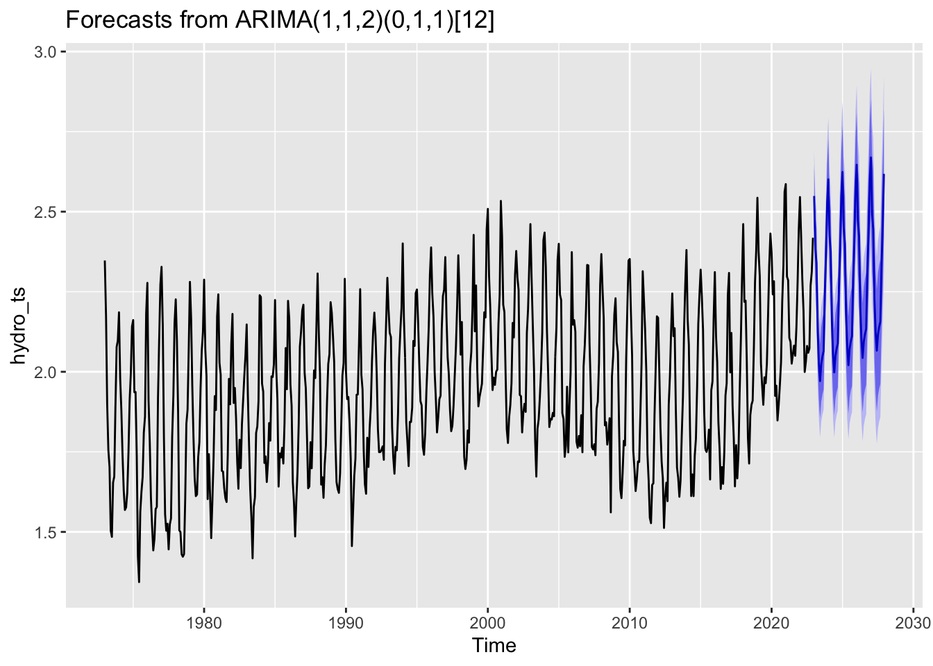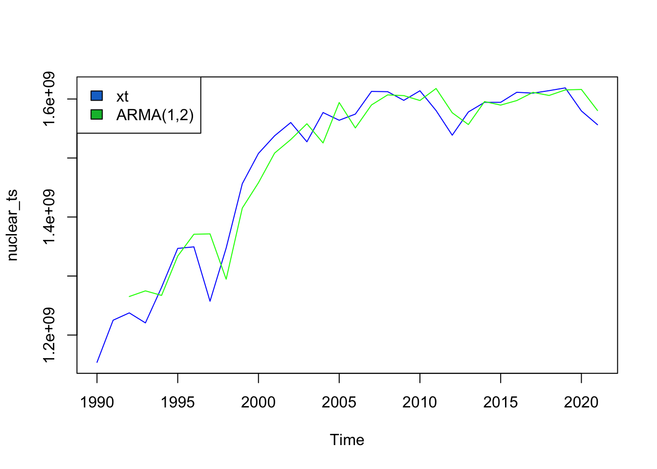 ARMA(1,2) for nuclear produces an AIC value of 1212.39 and a CSS value of 3.76x10^16. It seems that the model fits the data pretty well but not perfectly. To achieve a better fit would require overfitting the training data and wouldn’t generalize well to new data.