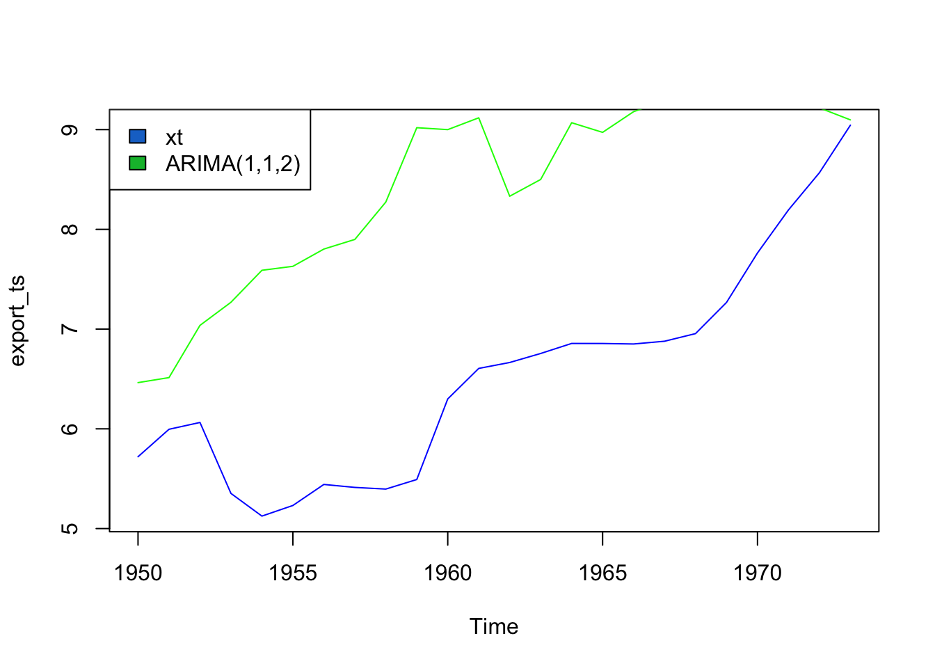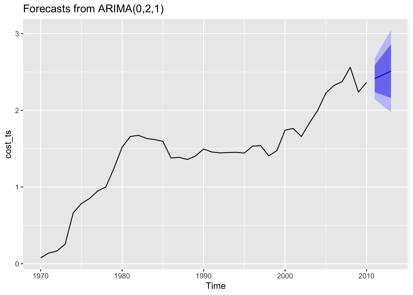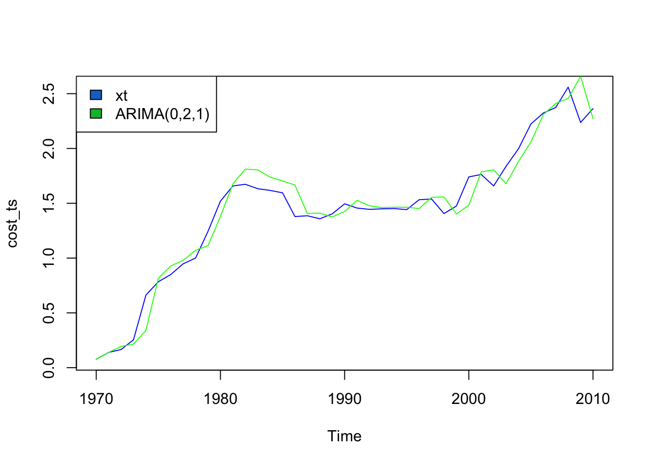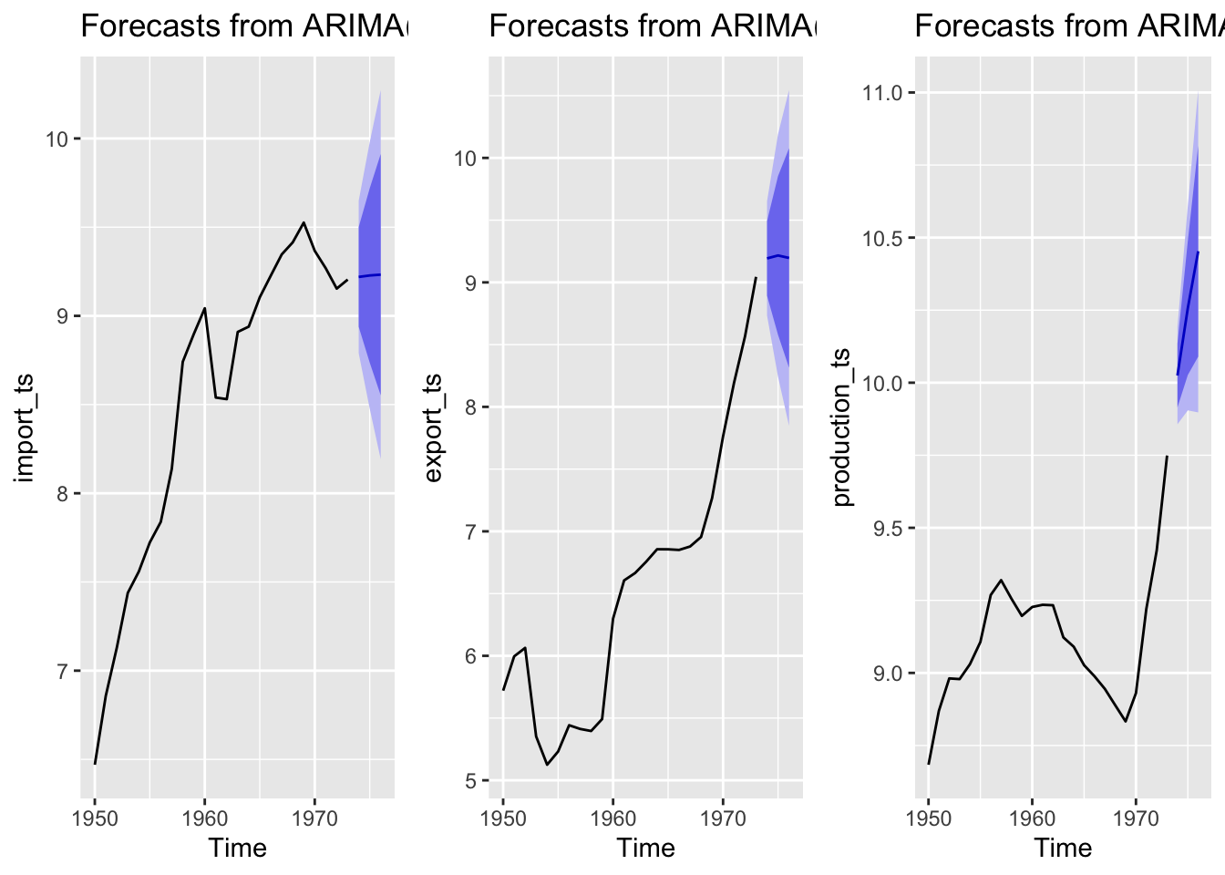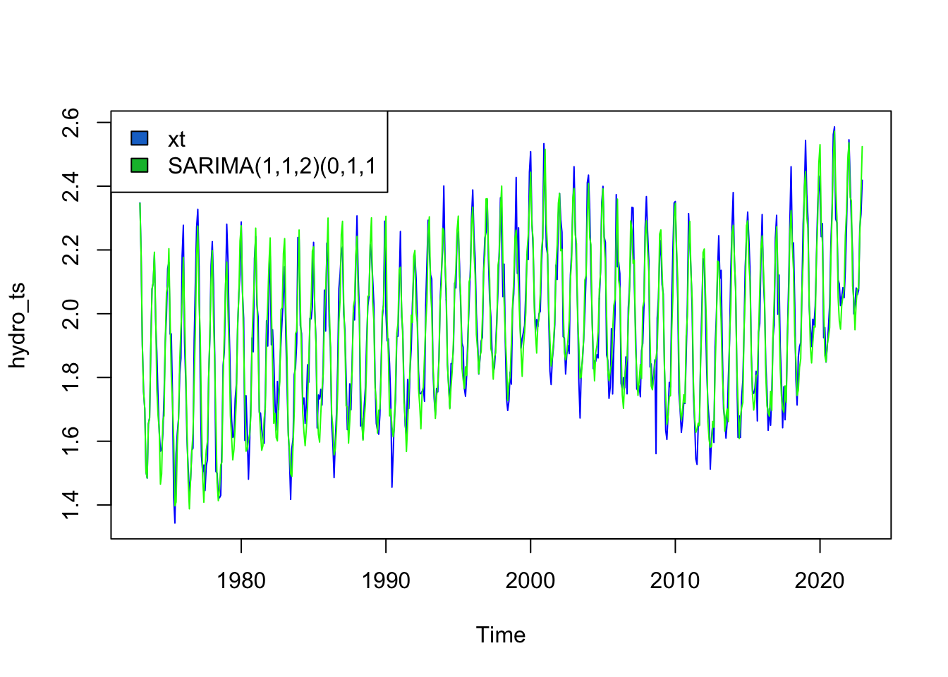 ARMA(1,2) for nuclear produces an AIC value of 1212.39 and a CSS value of 3.76x10^16. It seems that the model fits the data pretty well but not perfectly. To achieve a better fit would require overfitting the training data and wouldn’t generalize well to new data.