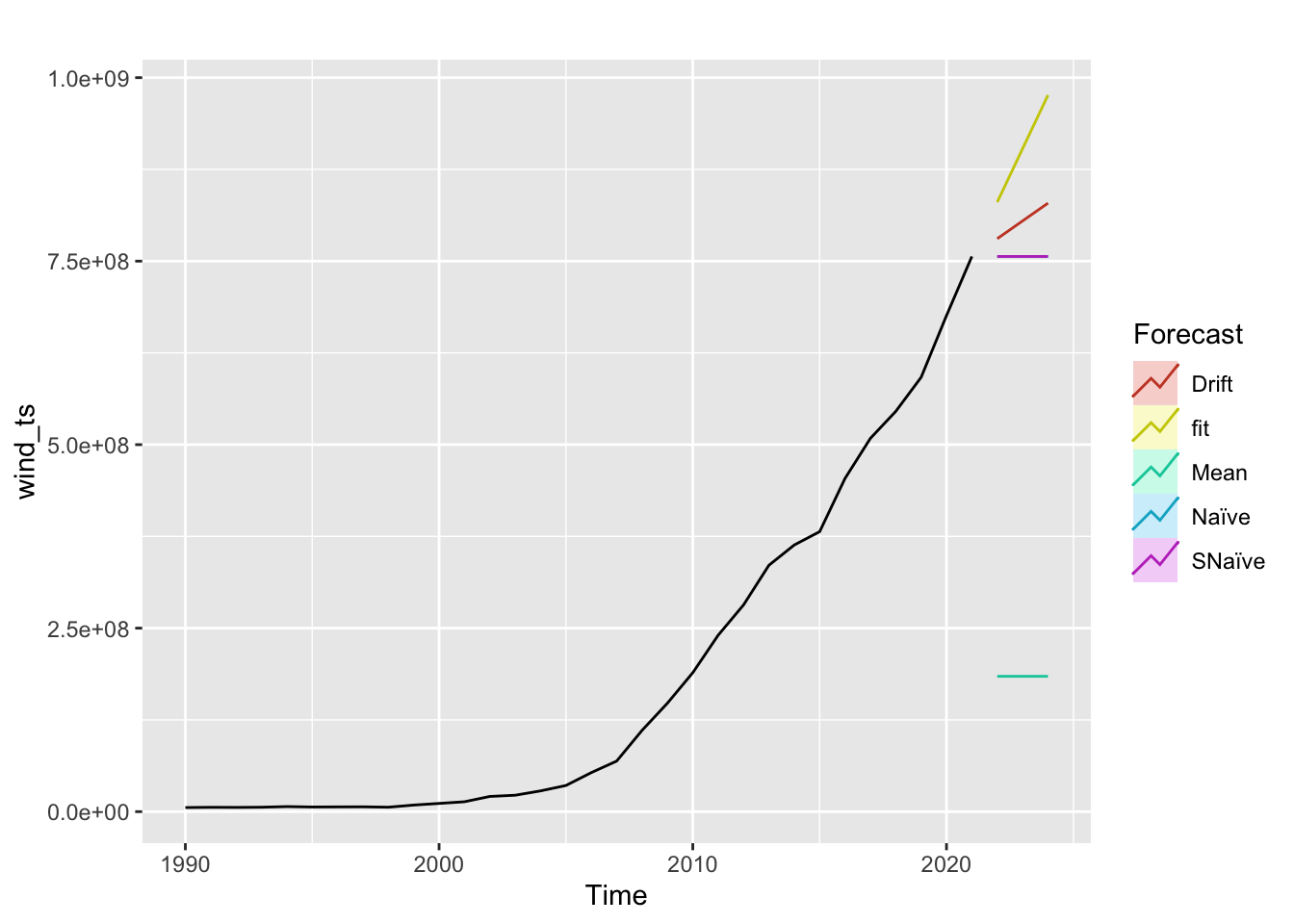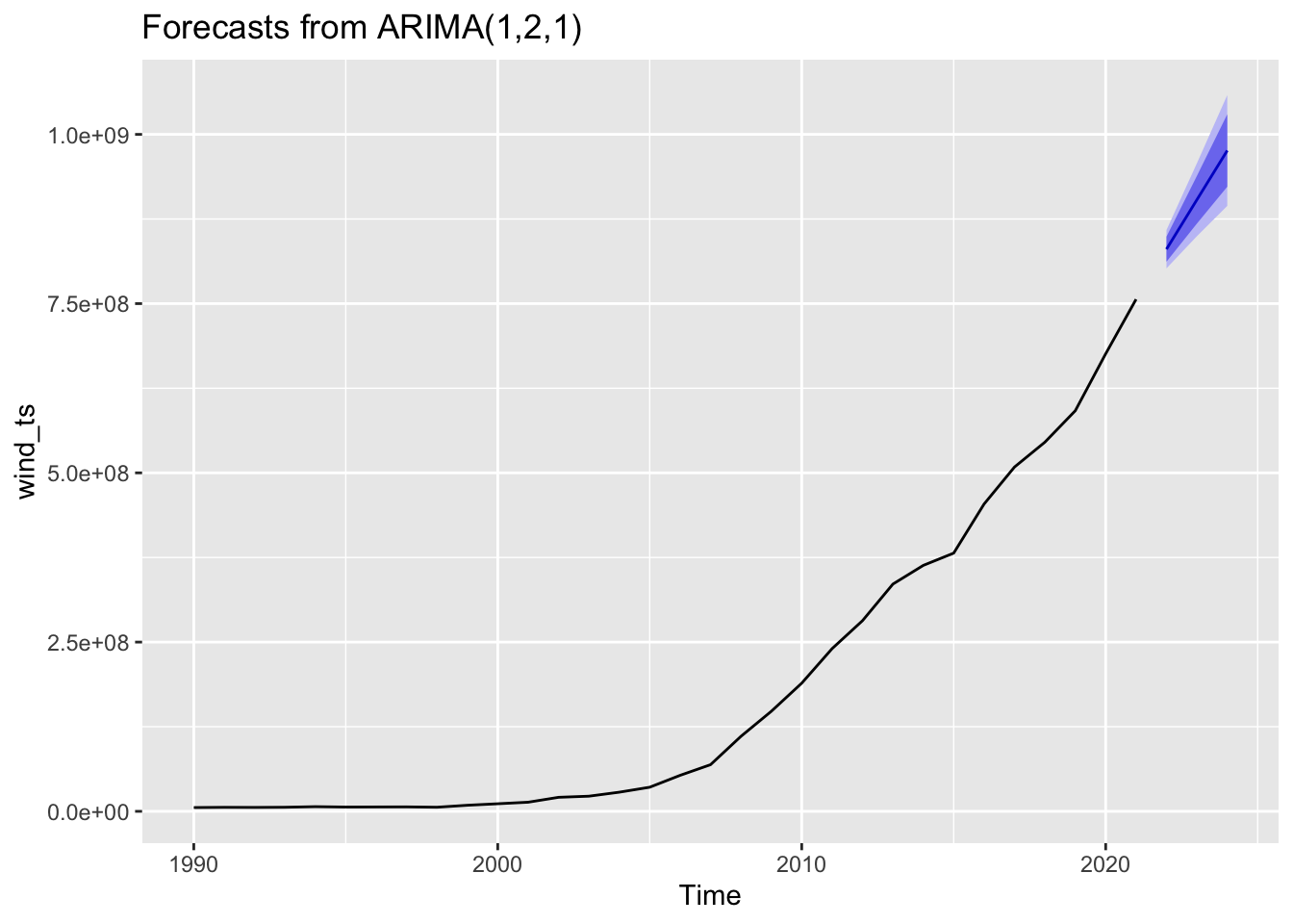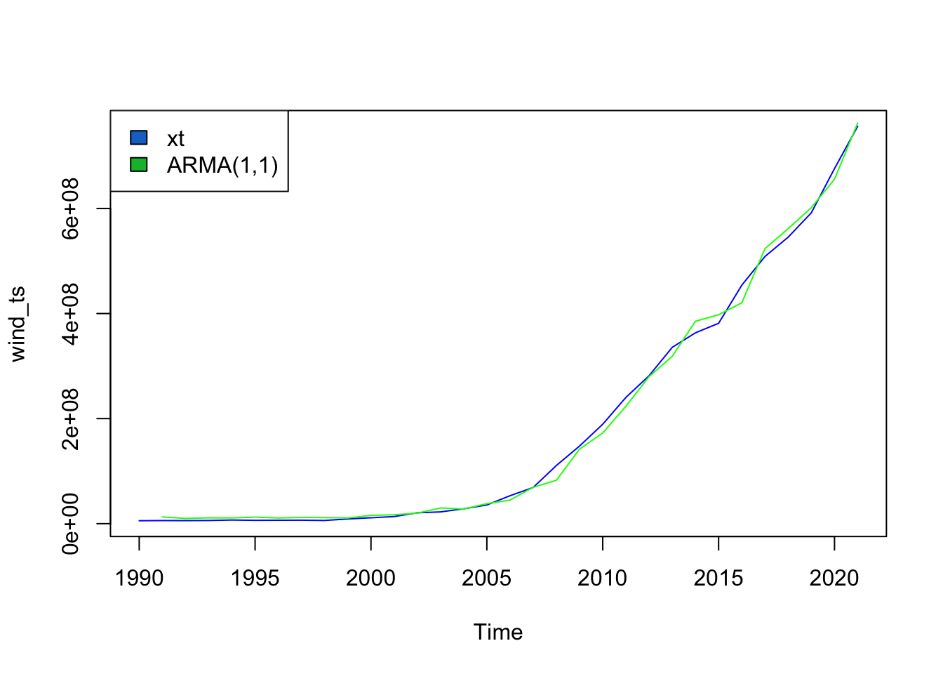ARMA(1,1) for wind produces an AIC value of 1144.57 and a CSS value of 4.97x10^15. The model fits this data much better than the previous data as it follows a steadier upward trend over time as wind production has been more widely adopted by US states. Additionally, wind power is less prone to political shocks so is easier to predict and fit.