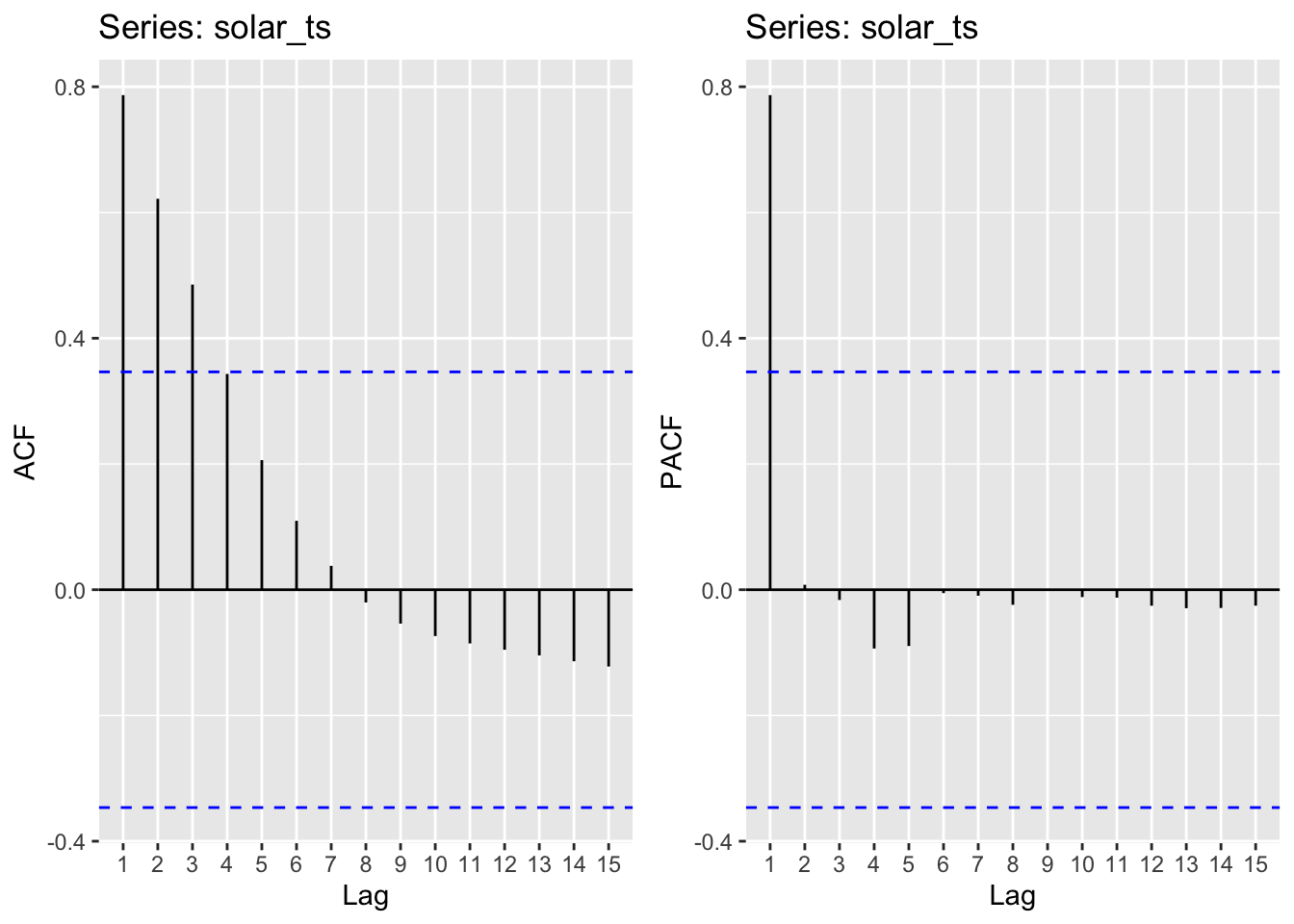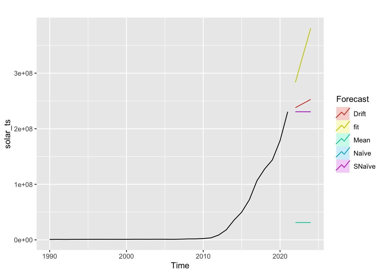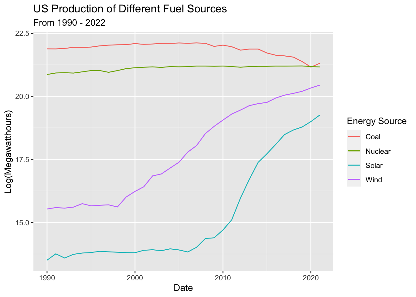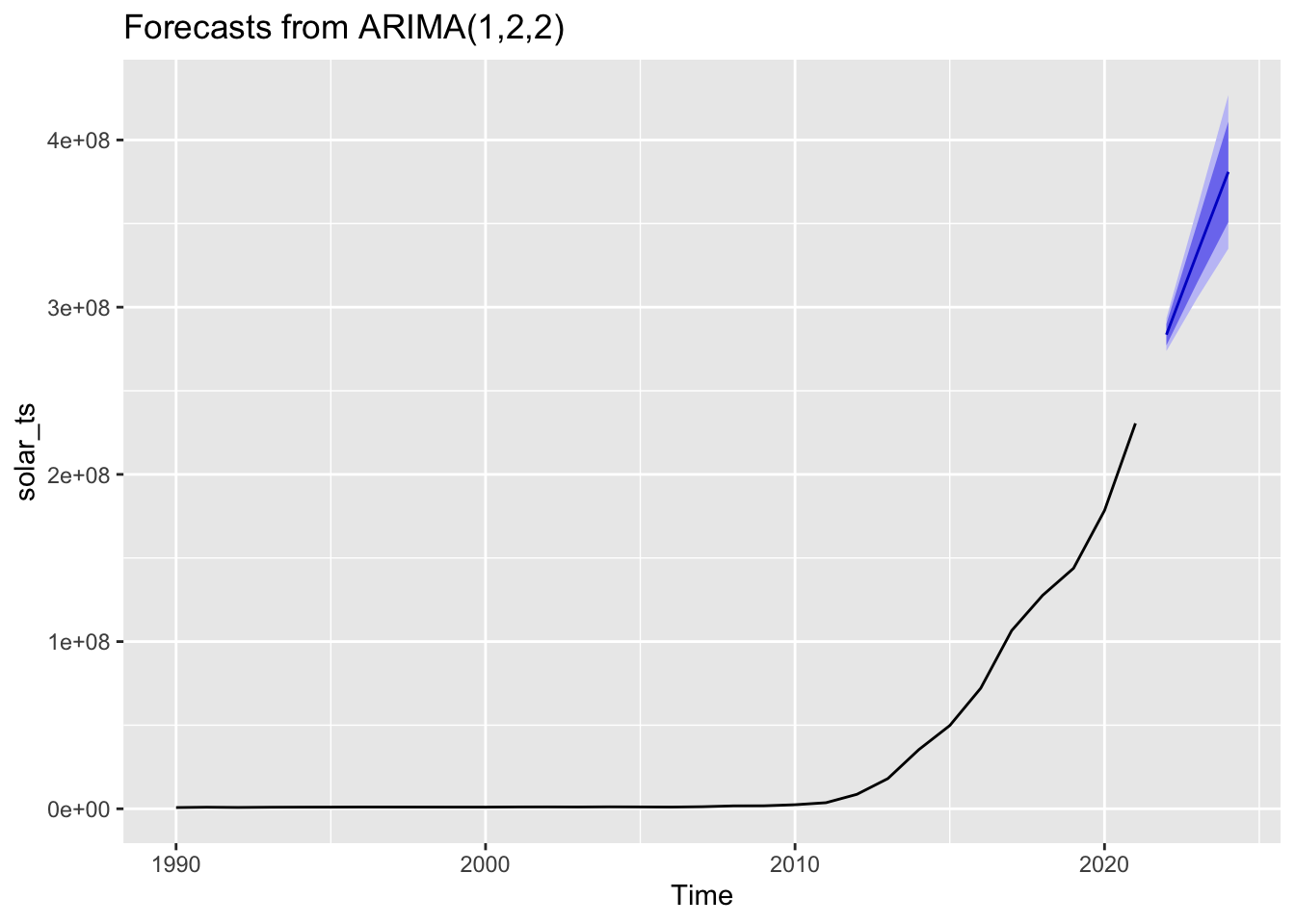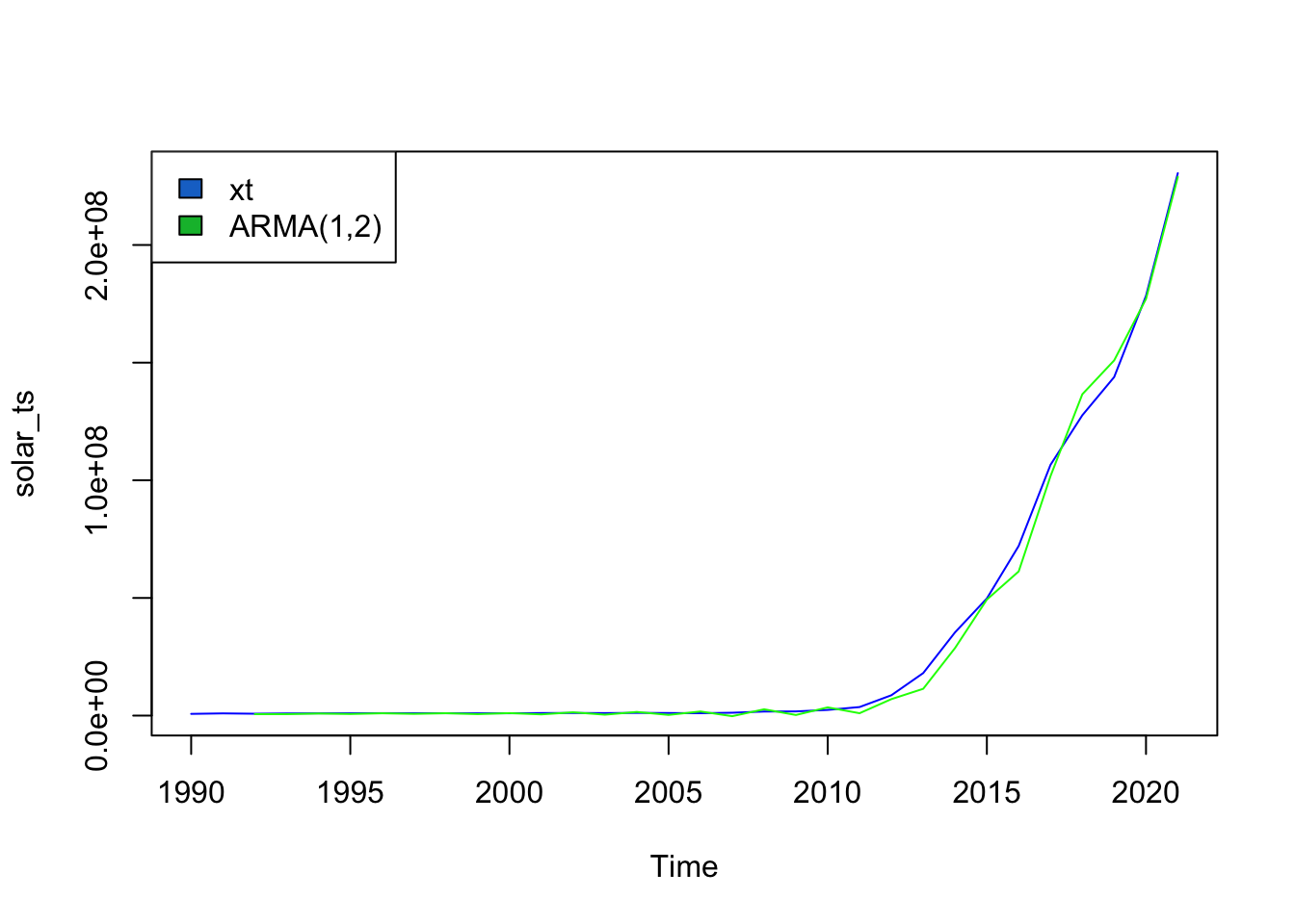 Simiarly, ARMA(1,2) for solar produces an AIC value of 1,063.94 and a CSS value of 3.82x10^9. The model fits this data much better than the previous data as it follows a steadier upward trend over time as solar production has been more widely adopted by US states. Additionally, solar power is less prone to political shocks so is easier to predict and fit.