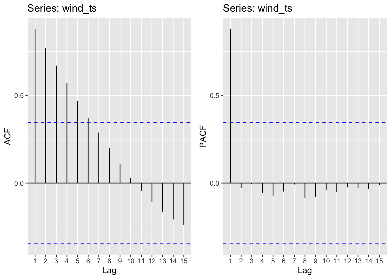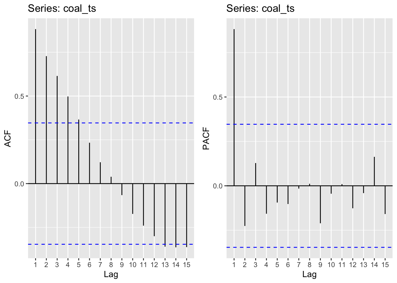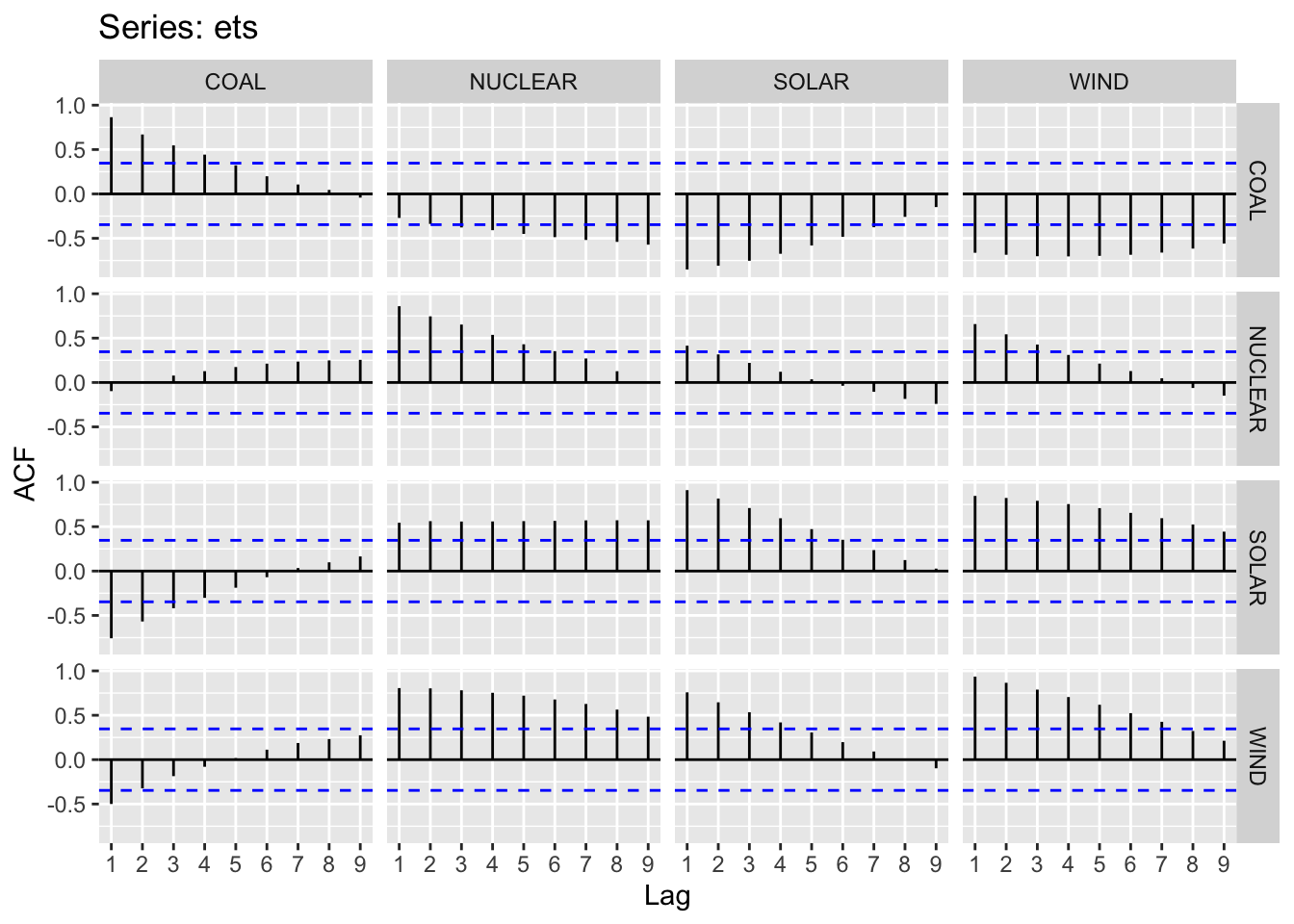 ACF/PACF plots are used to select potential p and q values for an ARMA(p,q) model. ARMA is used because no differencing of the data occurred. From these plots, some potential p and q values are selected to fit an ARMA model with. Separate models have to be fit for each energy source, thus separate ACF/PACF plots are shown below.
