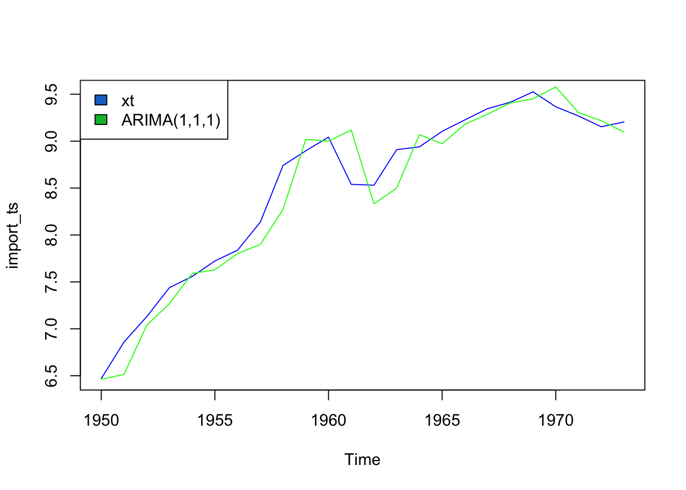 \[ \phi(B) = 1 - 1.07(B) \] \[ \theta(B) = 1 + 3.29*10^-1 *(B) + 3.552*10^-2*(B^2) - 5.782*10^-1*(B^3) \]