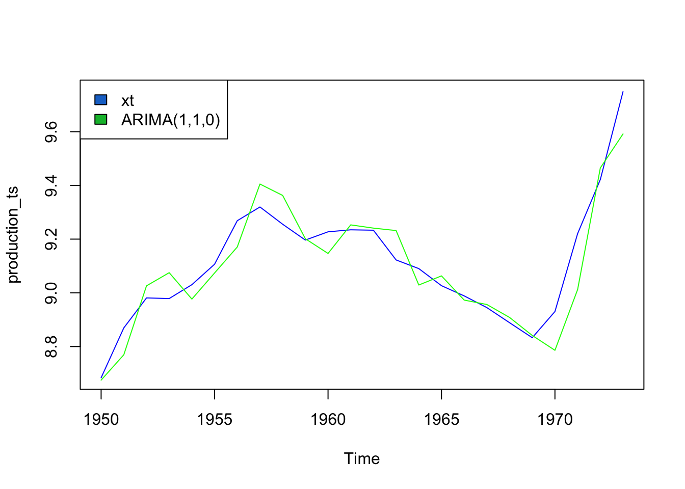 Auto.arima() chooses AR(2,2) as the best model, very different from my chosen model of AR(1,3). This is likely because auto.arima() considers a more comprehensive set of parameters (i.e. I didn’t check p=2 as a possible value) and I chose my model based on AIC alone whereas auto.arima() chooses models based on AIC, BIC, and AICc.