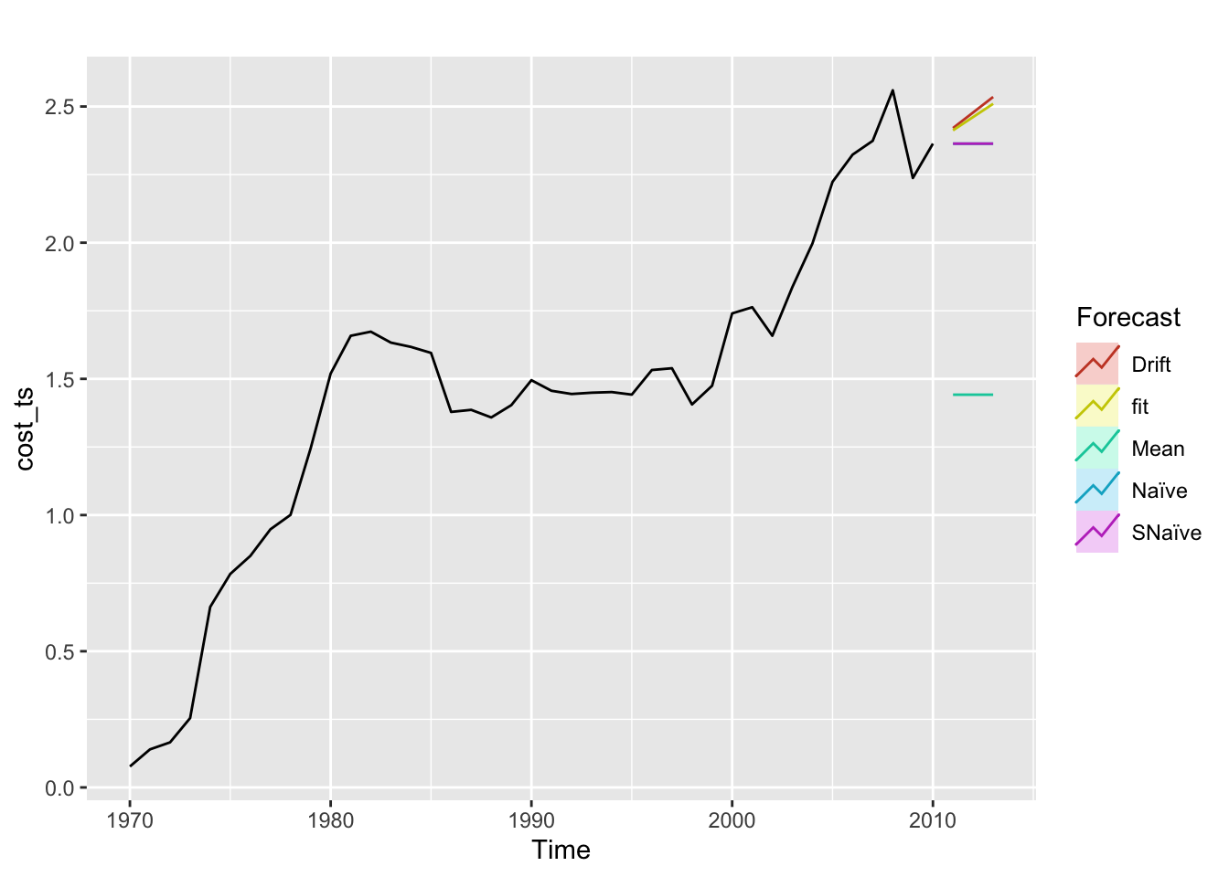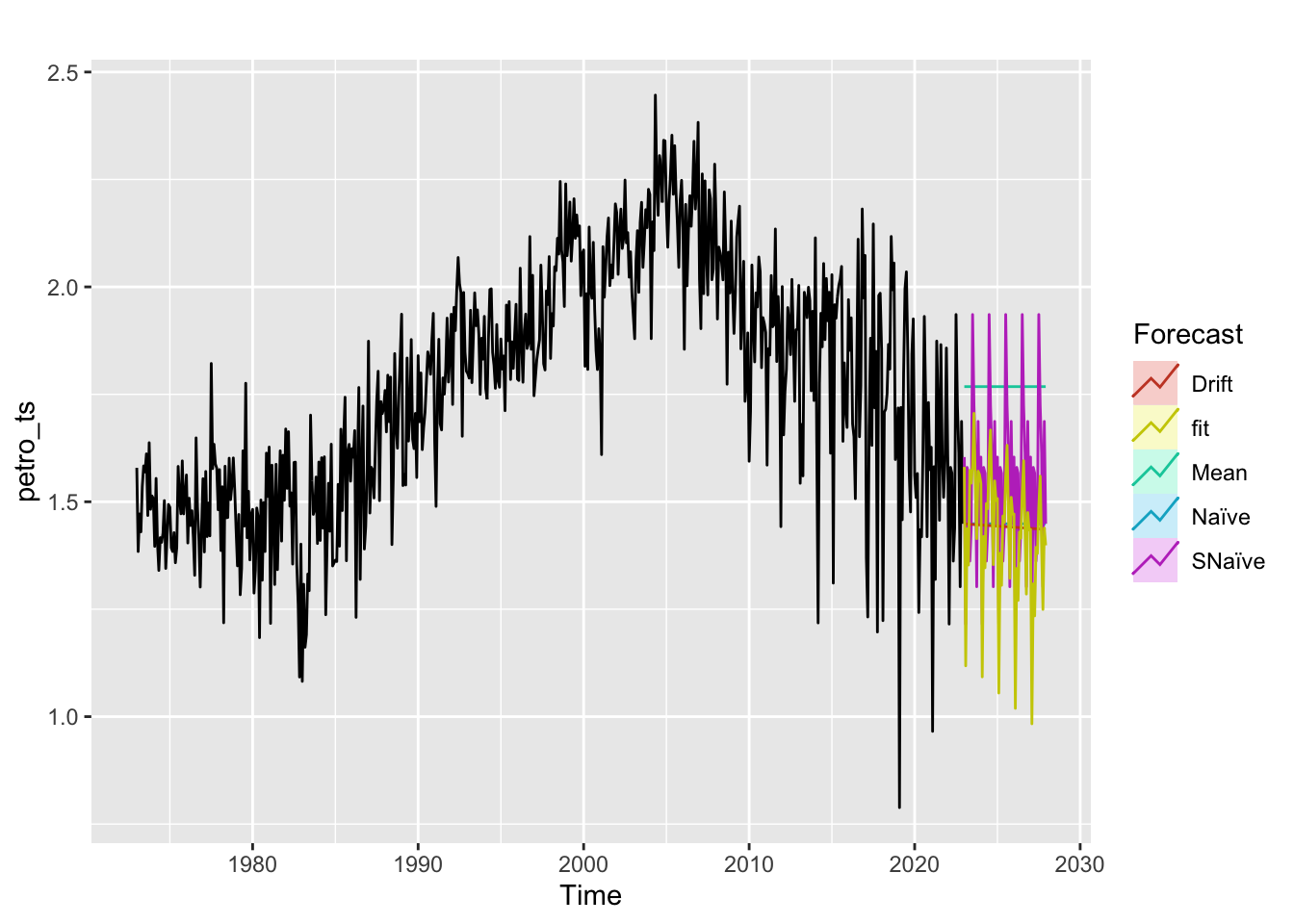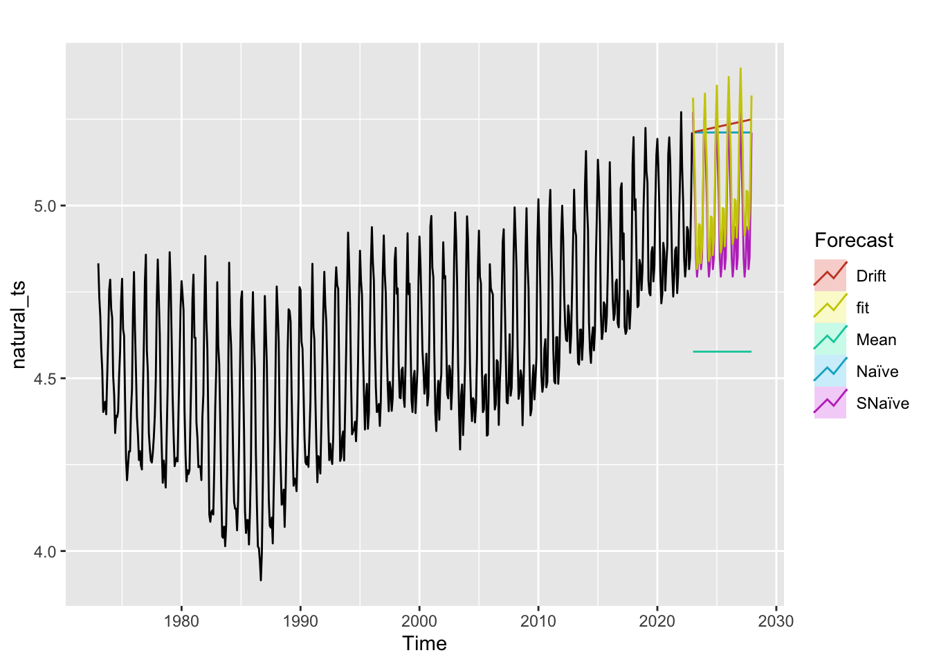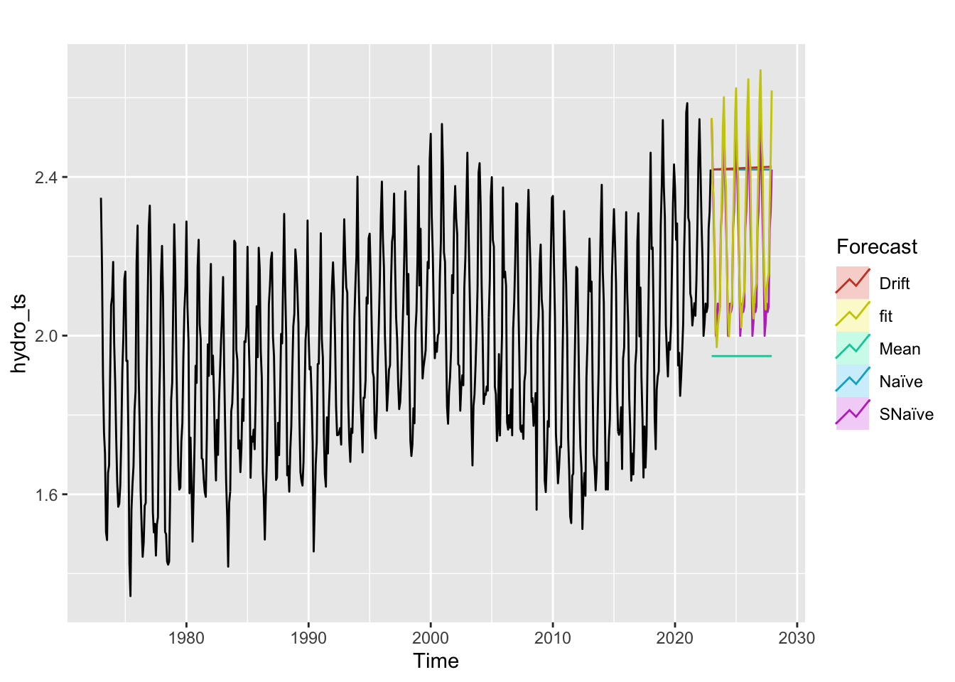 Drift, Mean and Naive methods predict constant emissions over the next 5 years. Seasonal naive predicts increasing CO2 emissions with seasonal variation, but the fit outperforms seasonal naive and it follows the trend slightly better.
