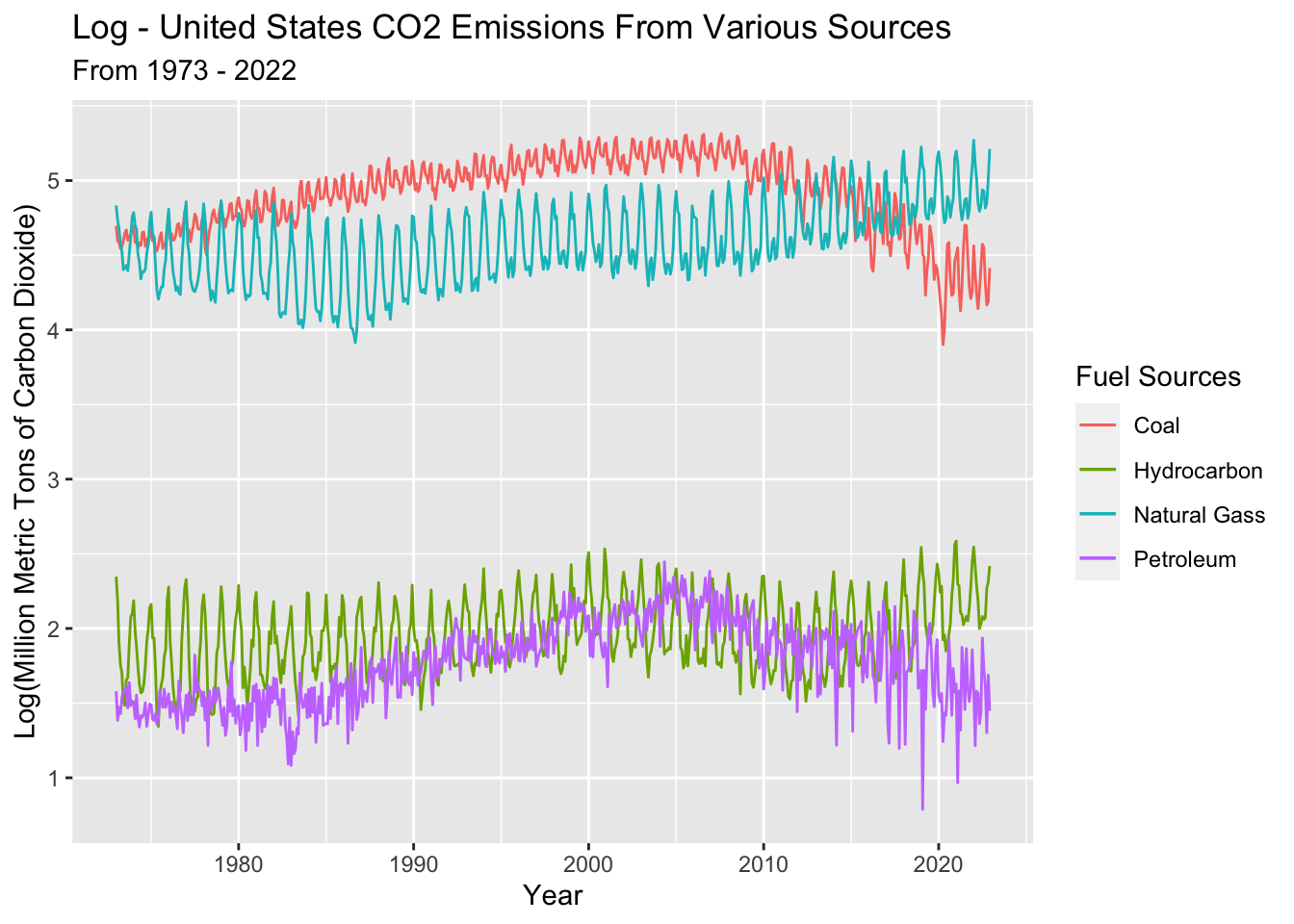 According to our models, coal emissions are expected to continue their steep downwards trend over the next 5 years, while CO2 Emissions from Petroleum are also expected to decrease over the next 5 years - albeit slightly less dramatically. CO2 emissions from both Hydrocarbon Gas and Natural Gas are forecasted to increase over the next 5 years.