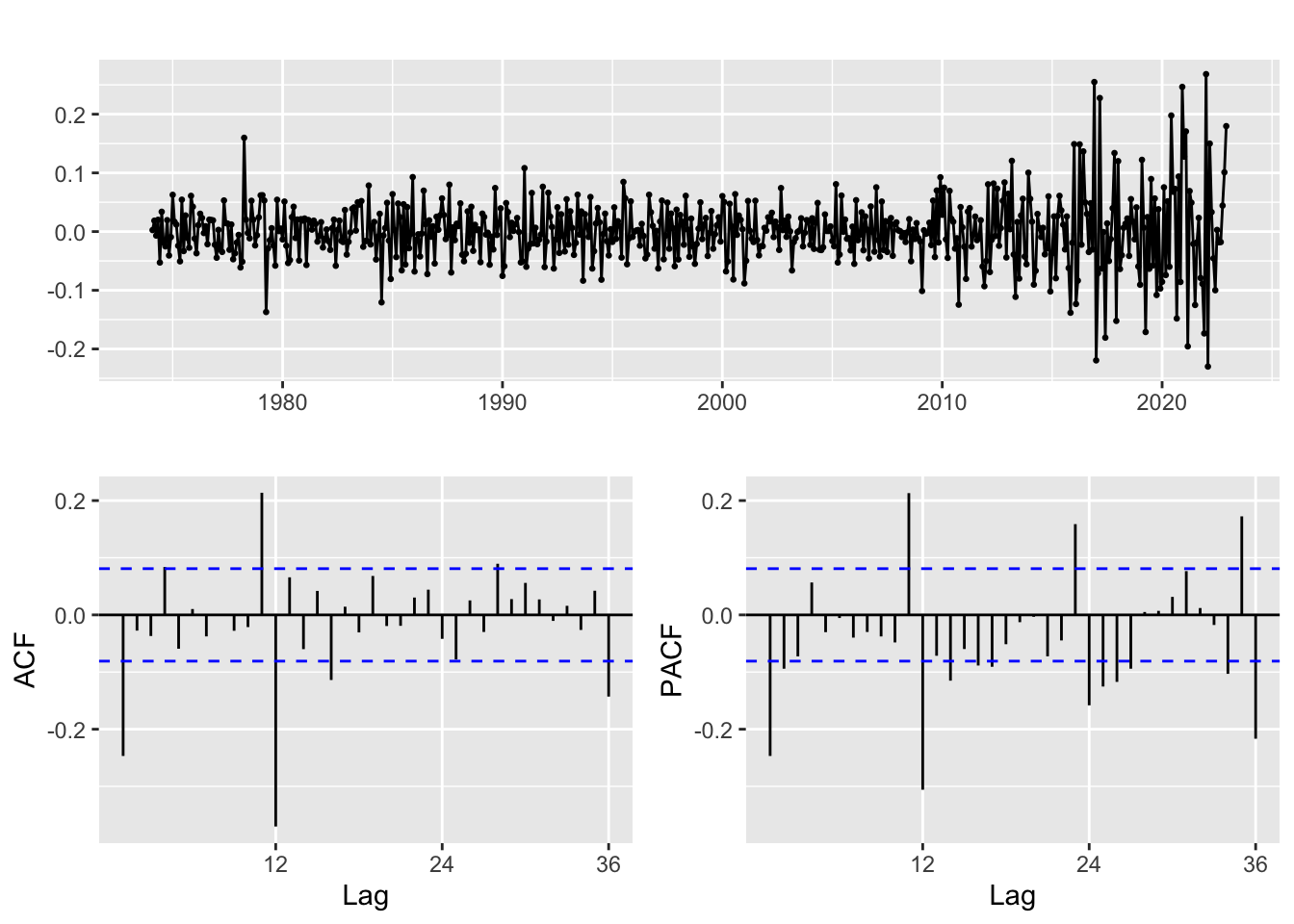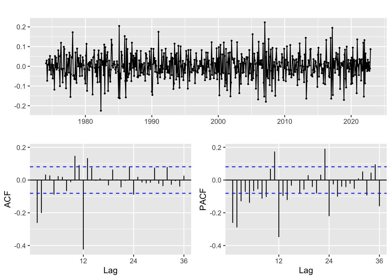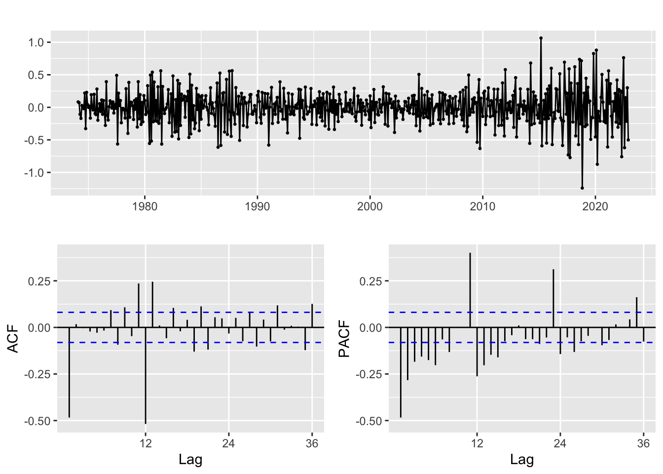 \[ \phi(B) = 1 - 8.976*10^-1(B) \] \[ \theta(B) = 1 - 5.65*10^-2 *(B) + 3.256*10^-1*(B^2) \]