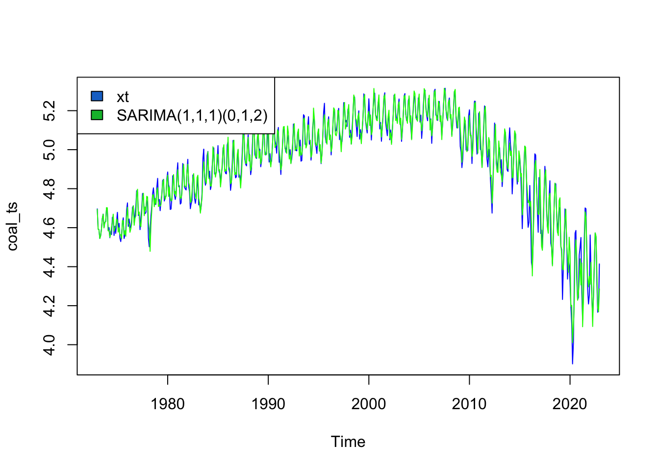 Coal ARIMA(1,1,1)(0,1,2) for both auto.arima() and manual fitting.