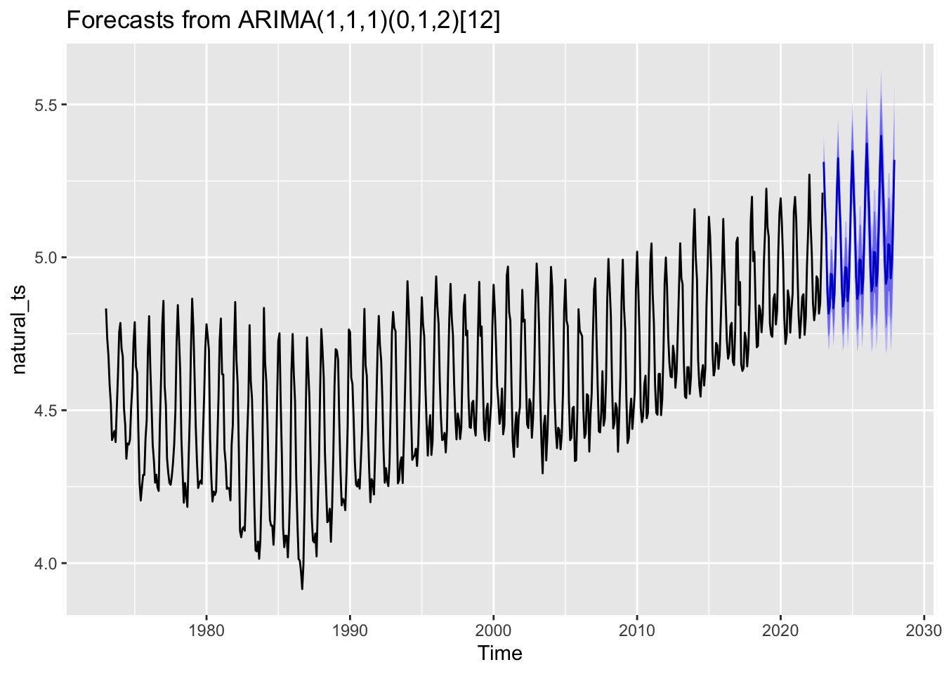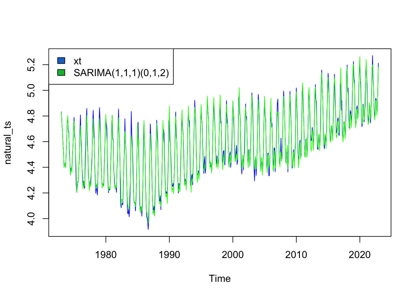 Natural gas ARIMA(2,1,1)(1,1,1) for auto.arima() and ARIMA(1,1,1)(0,1,2) from manual fitting.