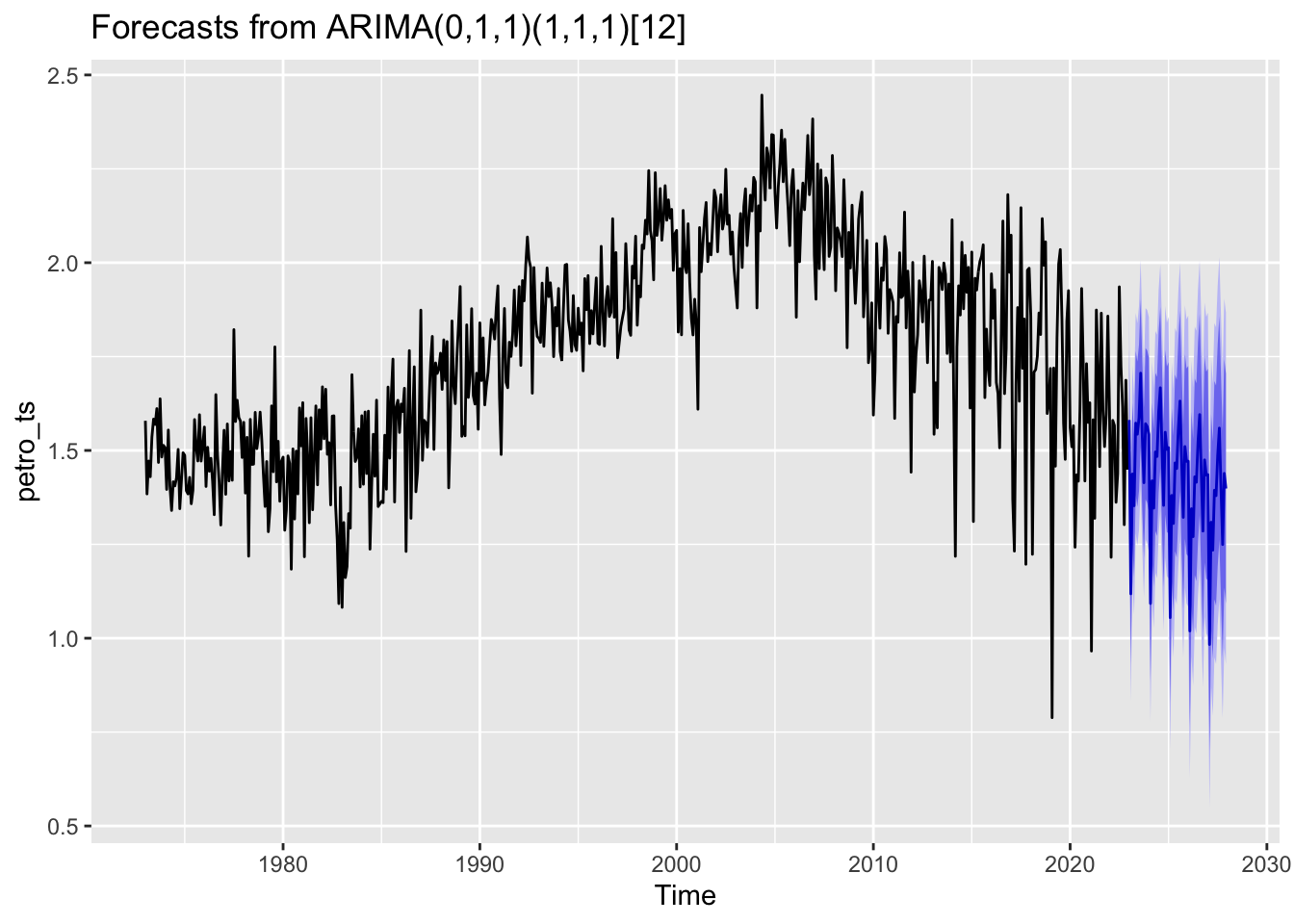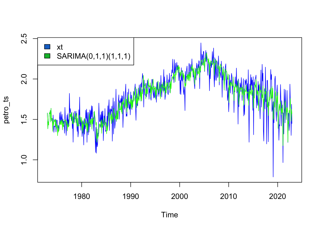 Petroleum ARIMA(0,1,1)(0,0,2) for auto.arima() and ARIMA(0,1,1)(1,1,1) from manual fitting.