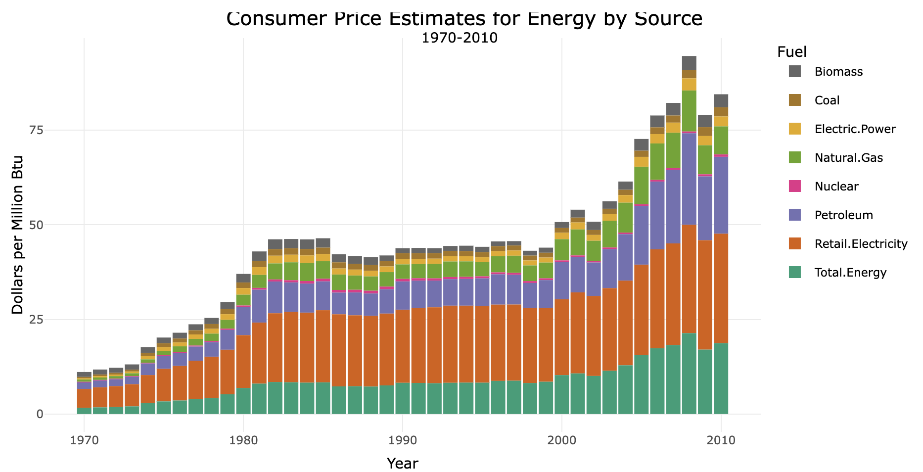 Another critical part of answering this big picture question about Energy in the US was understanding how much different fuel sources cost the consumer over time. Wider adoption of cleaner energy is contingent upon its economic competitiveness with traditional fossil fuels. Coal, petroleum, and natural gas have all trended upwards since 1970 (not adjusted for inflation), facing a 536%, 1,183%, and 1,088% increase respectively. Cleaner fuels like biomass have grown 167% while nuclear power grew 245% since 1970. Building on the findings above, where we saw that nuclear was an important contribution to the US’ fuel arsenal and was produced in much higher quantities than other renewables, we see that nuclear is by far the cheapest fuel source. It beats even coal and biomass, and even though building new nuclear power plants is expensive they are relatively cheap to run. Given its production capabilities, relative economic benefits, and environmental and health benefits, nuclear power absolutely one of the best choices for powering the US into a cleaner future.