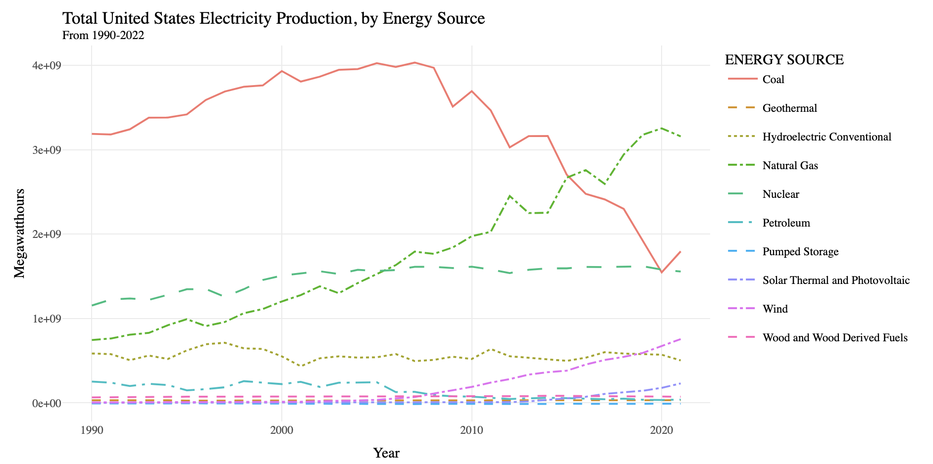 One of the key findings of this analysis is how the United States’ energy production has changed in the past 30 years. Coal is historically the country’s most popular fuel source, and thus the fuel source that is produced at the highest rates. However, coal is also the dirtiest and worst fuel source as it produces more pollution than any other energy source. According to Enova Energy Group, “coal produces just 44% of US electricity, [and] it accounts for 80% of power plant carbon emissions.” However, when looking at production of different fuel sources it looks like coal production has decreased since 2007. This is largely driven by the rise in natural gas - another fossil fuel but a cleaner fossil fuel than coal. To be clear, natural gas still contributes to air pollution and CO2 emissions heavily and has other risks associated with it like drilling and fracking costs. Its chemical structure is also more effective at trapping heat in the atmostphere than coal - and thus is a fuel source to be avoided in the long term. However, given its influence in driving the US away from coal and petroleum it is an interesting possibility to use natural gas as a bridge fuel source in the short term. Another interesting and critical fuel source to focus on is nuclear power. Nuclear is one of the most freely available and easy to produce renewable energy sources in the world as it’s emission free and “saves about 2.4 billion tons of carbon emissions per year” (EEG). There are many public safety concerns about nuclear power given its radioactive waste and disasters like Chernobyl that affect public opinion of the fuel. However, it’s clear from the chart below that nuclear power is a renewable fuel source that doesn’t face the same production and storage constraints as other renewable fuels like solar and wind and thus should be invested in further.