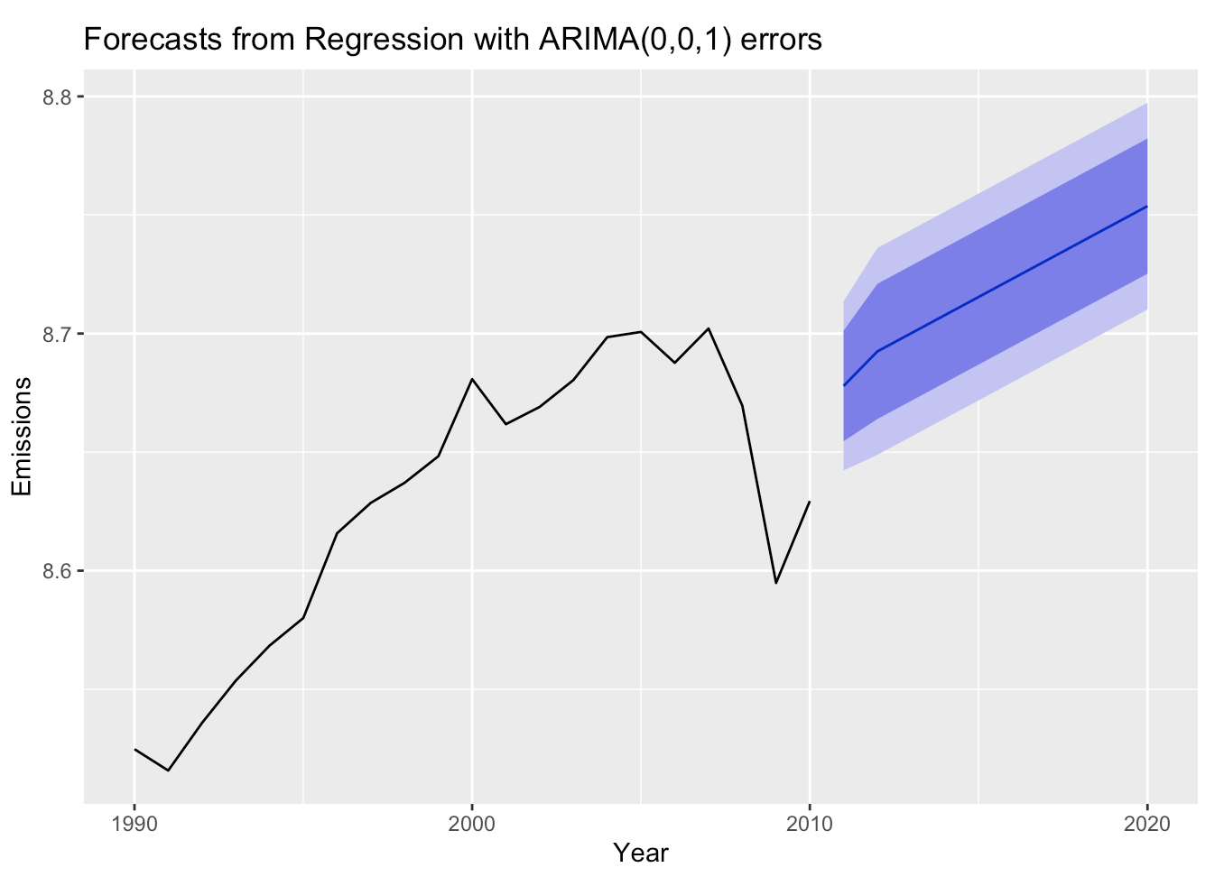 Based on the above, it makes sense that total CO2 emissions (predicted from production and cost time series data) are forecasted to increase! The current infrastructure in the US and globally is still heavily dependent on fossil fuels - which produce far more CO2 than renewable fuels. Unfortunately, even though natural gas is cleaner than coal or petroleum, it is still extremely damaging for the environment. Thus, seeing a projected increase in natural gas production is still a troubling outcome and absolutely contributes to the forecast seen below. In order to adddress this, we need to identify clean fuels that have the same production capacity as fossil fuels and are cheaper than fossil fuels. At this time, nuclear is likely the best fuel to address these needs. ARIMAX and VAR models were used to understand this question.