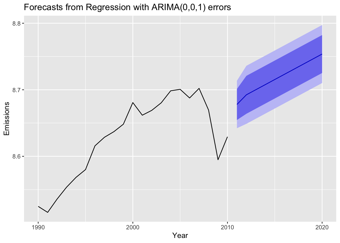 The data only went until 2010, so emissions are forecasted for the next 10 years. The forecast from regression with ARIMA(0,0,1) predicts emissions steadily increase. Despite a dip in emissions in 2008, the forecast follows the upwards trend occurring at the end of the time series in 2010, which predicts growing emissions.