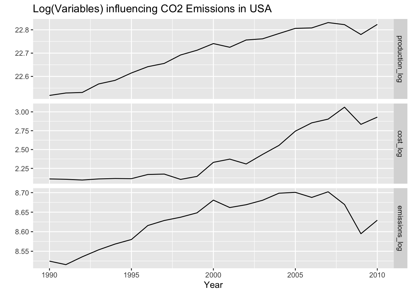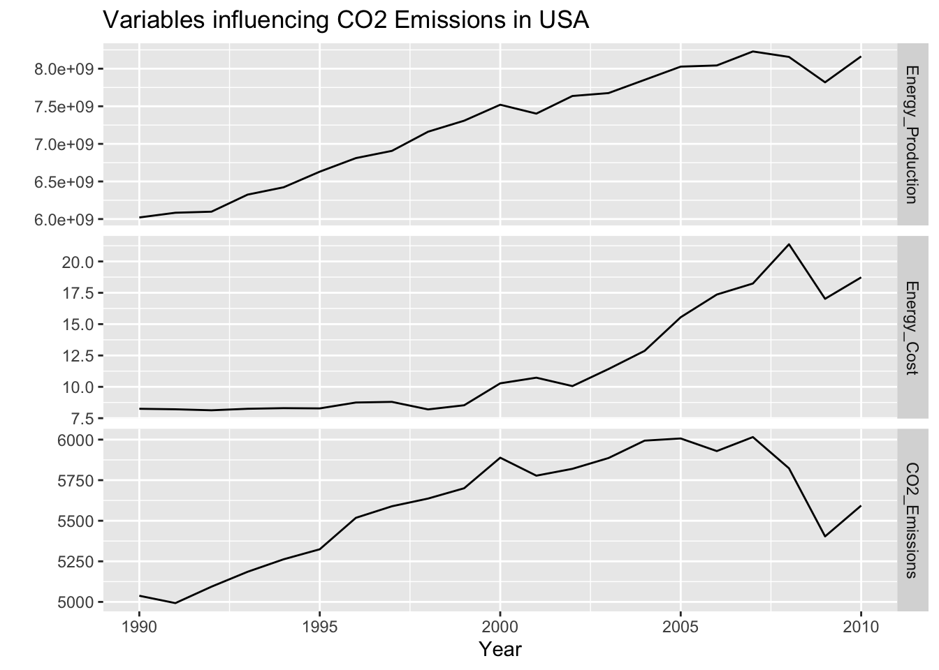 The key response variable here is total CO2 emissions from 1990-2010. The independent variables are total electricity production and total cost of electricity between 1990-2010. Due to data availability, these years were chosen and analysis has to be done at the annual level.